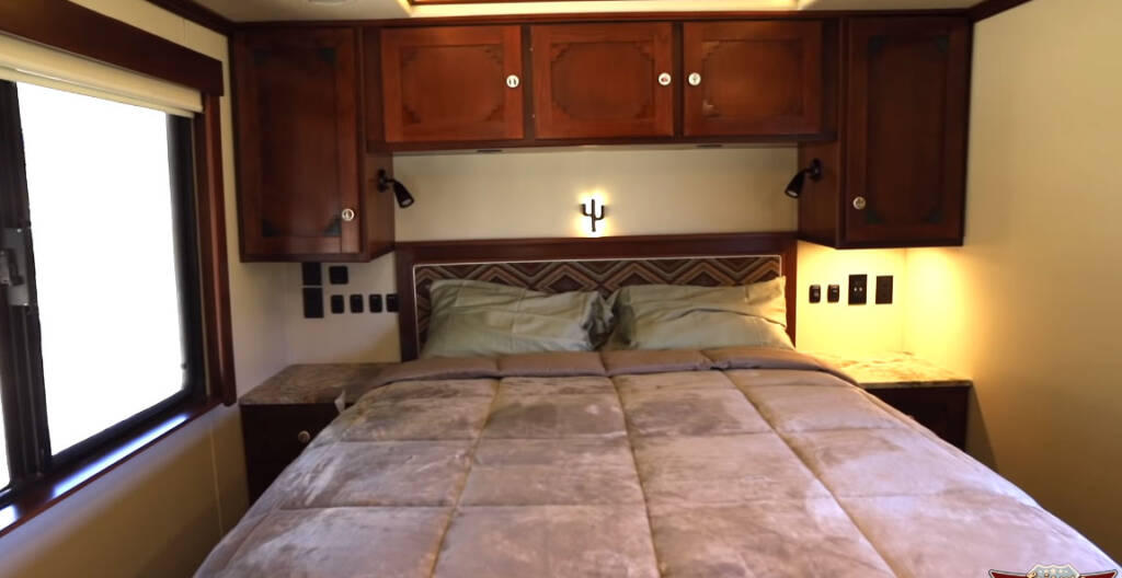 A queen-sized bed, built-in storage and side tables, and plenty of lighting options make this space serene and welcoming at the end of a long day. Continuing the Southwestern patterned accents keep the design of this build cohesive from front to back.