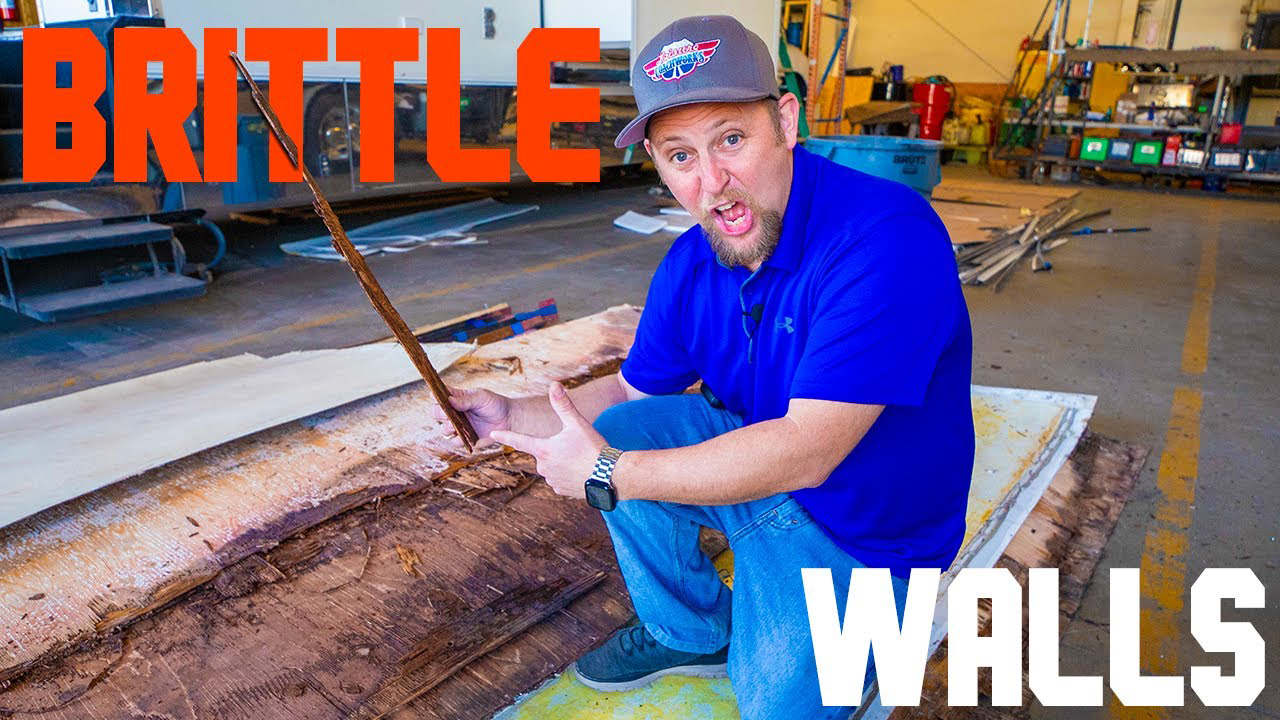 Jon shows us the damaged parts that have been removed from the Super C. We also get a glimpse at the structure of that usable space over the cab in a Class C motorhome. In this case, the manufacturer used several layers of plywood, sandwiched between two pieces of filon, to create the roof and walls.